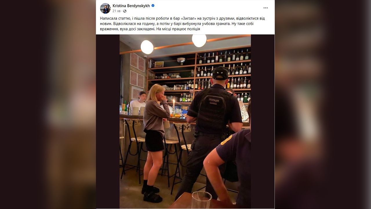 — Написала статью, и пошла после работы в бар Зигзаг на встречу с друзьями, отвлечься от новостей. Отвлеклась на час, а потом в баре взорвалась учебная граната. Такое себе впечатление, уши до сих пор заложены. На месте работает полиция, — рассказала она в посте в Facebook.