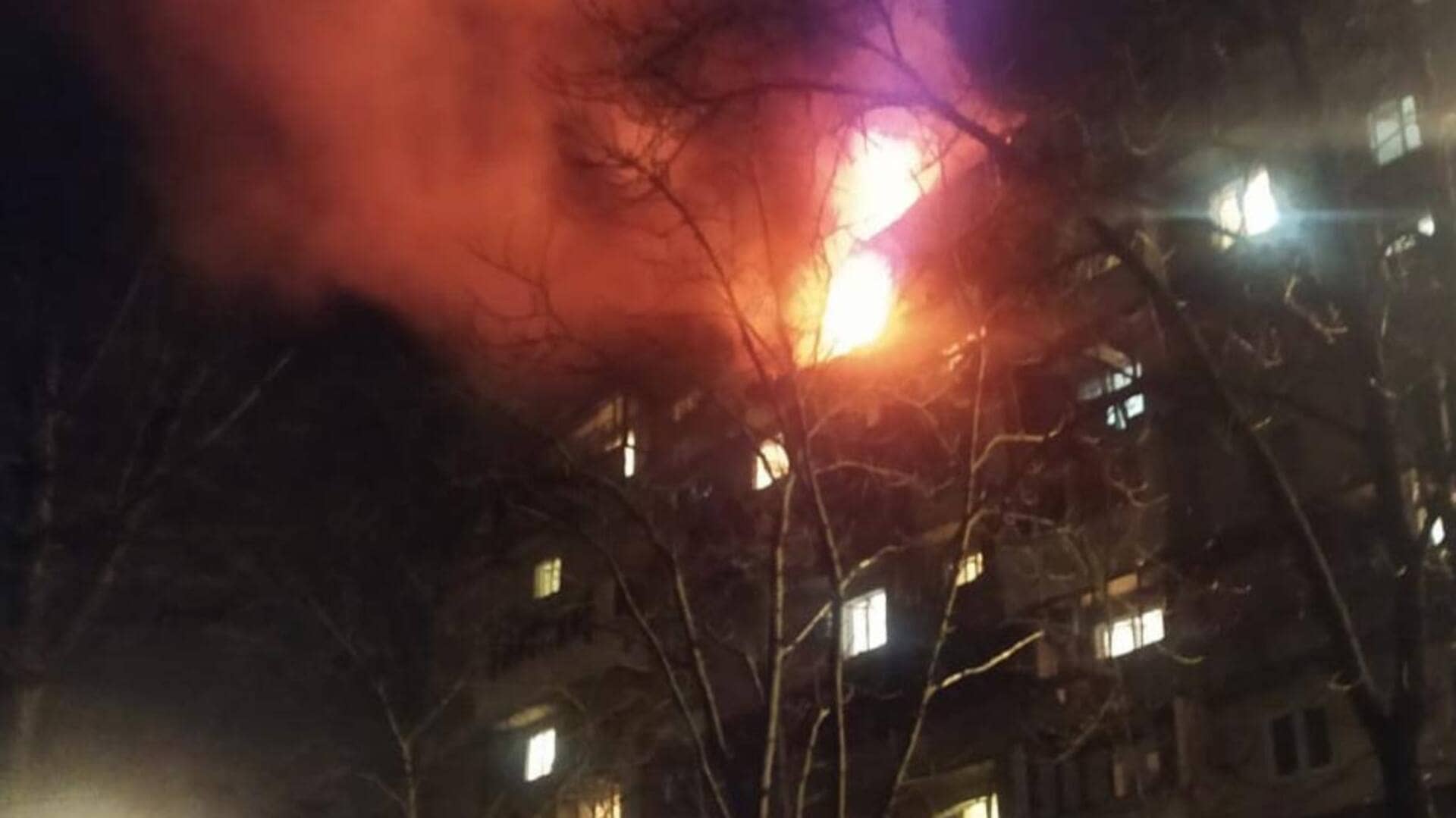 В другой девятиэтажке, куда попали обломки дрона, огнем охватило 100 кв. м площади на верхних этажах и крыше.