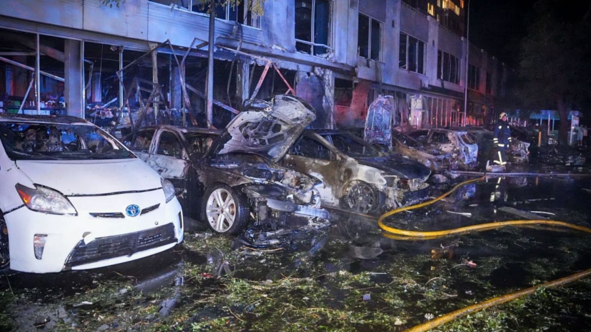 В частности, вспыхнули административное здание и легковые автомобили на парковке, в жилых многоэтажных домах выбиты окна, поврежден магазин.