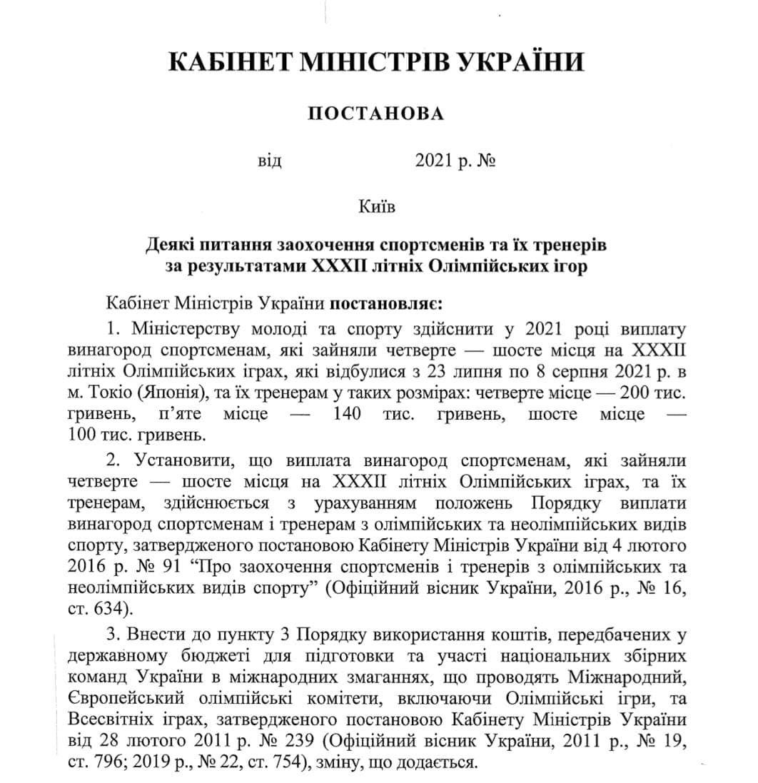Украинским спортсменам, которые заняли четвертое-шестое места на летних Олимпийских играх в Токио-2020 выплатят единовременно вознаграждение.