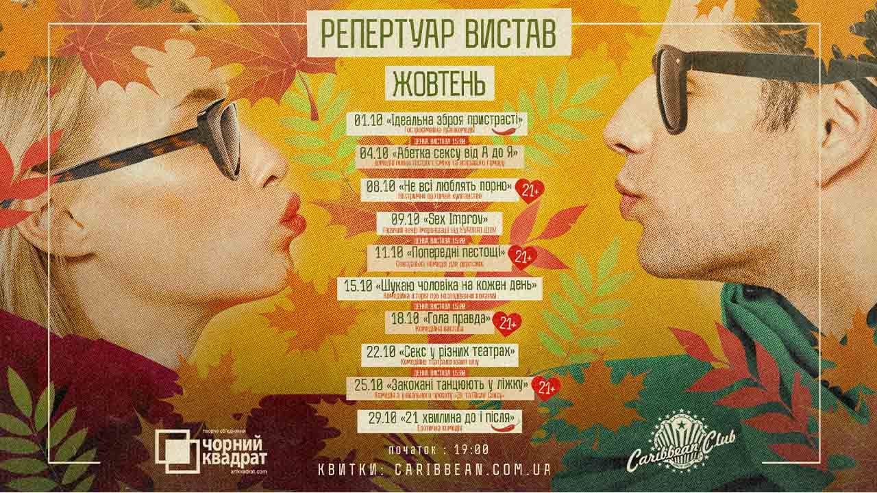 В октябре на сцене Caribbean Club — спектакли театра Черный Квадрат, известного своим откровенным юмором и острыми сюжетами. В репертуаре — истории о любви, сексе, отношениях и поисках себя.