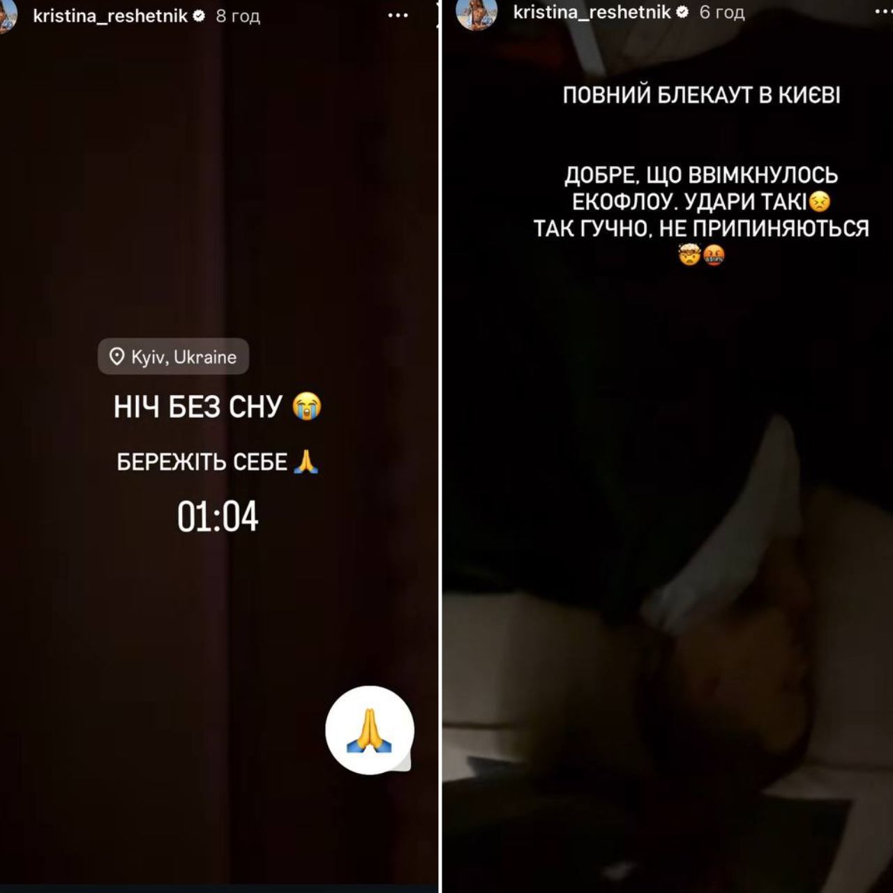– Полный блэкаут в Киеве. Хорошо, что включился эколфлоу. Удары такие – так громко, не прекращаются, – написала Кристина Решетник.