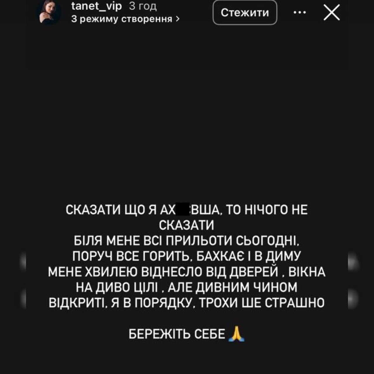 В сториз Татьяна сообщила, что в момент атаки находилась дома. Она поделилась, что взрывная волна буквально оттолкнула ее от двери.