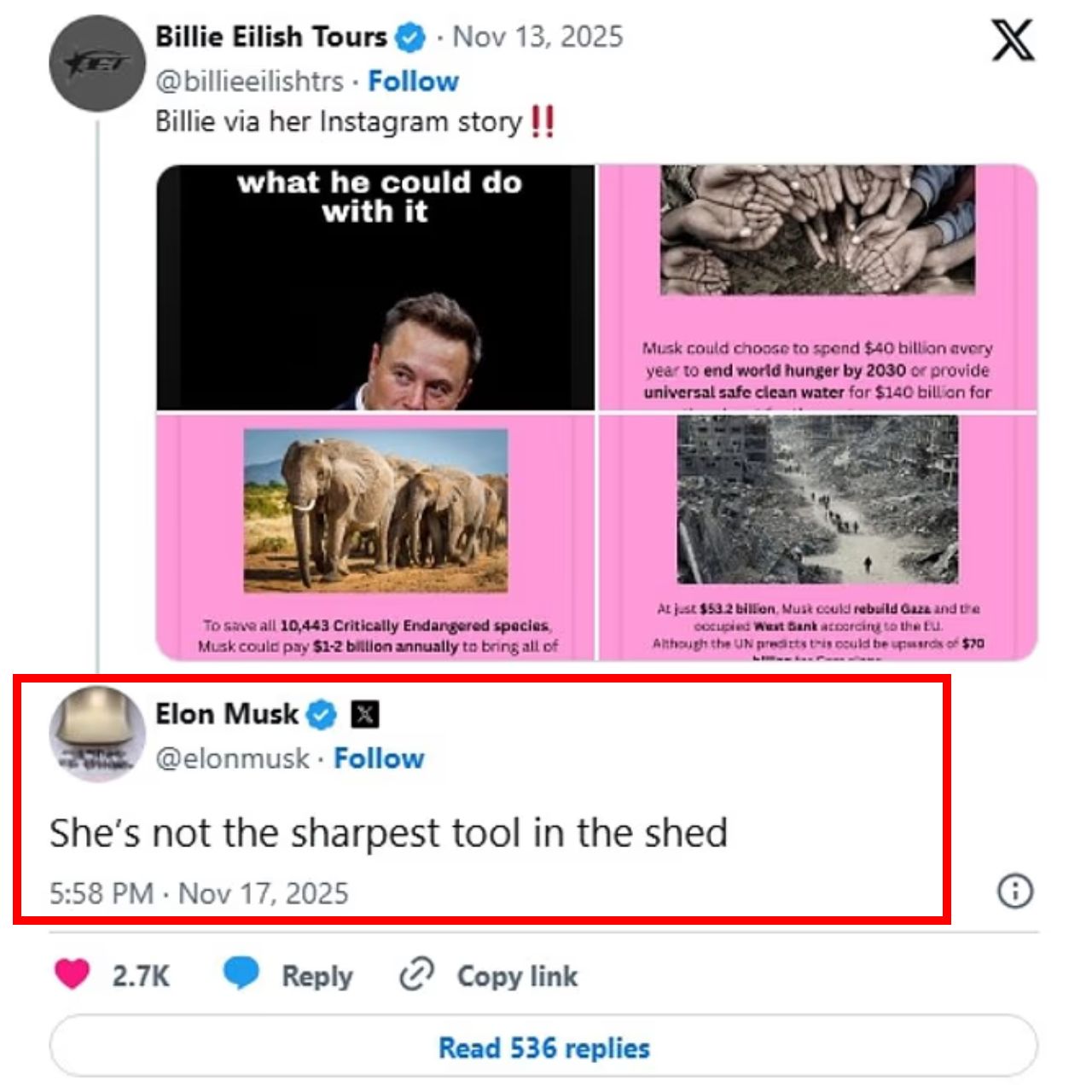 В других слайдах отмечалось, что более крупные суммы могли бы помочь в восстановлении Украины и Сирии. В конце серии Айлиш опубликовала черный экран с очень резким оскорблением в адрес «жалкие труса». Хотя она не указала прямо имя Маска, всем было ясно, что это написано о нем.