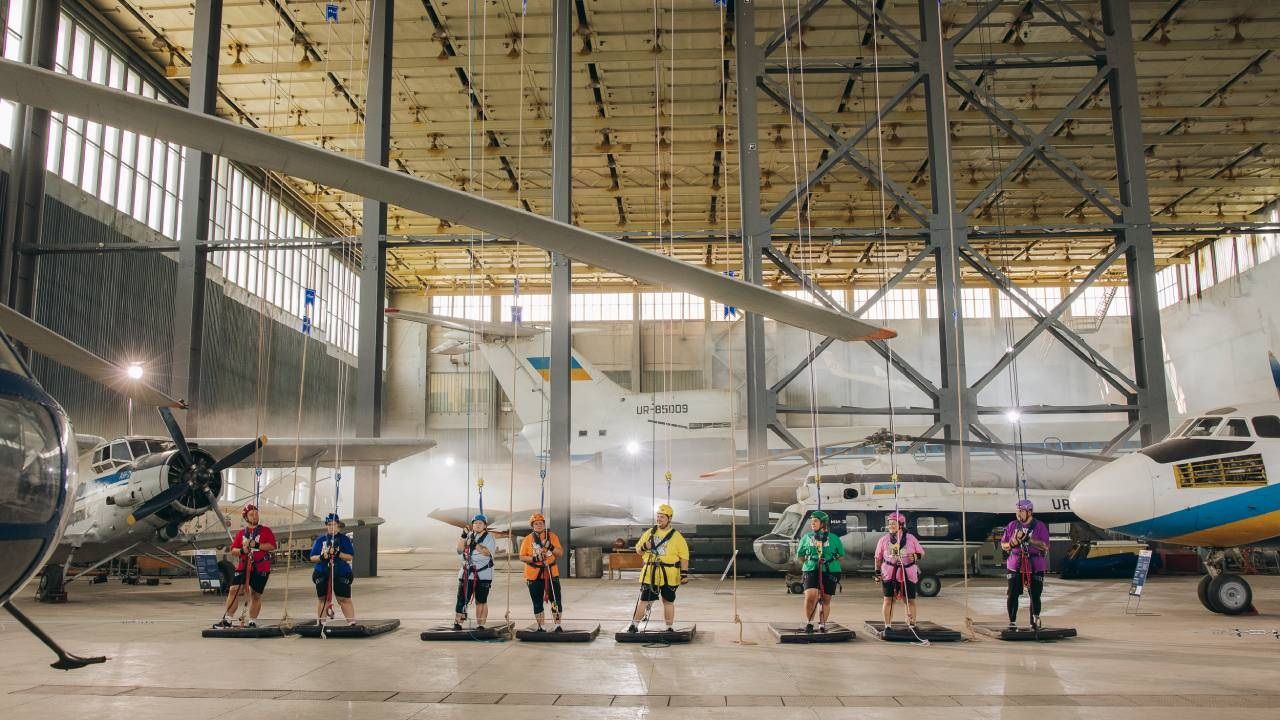 Первый индивидуальный конкурс провели в ангаре среди самолетов. Участникам нужно было подняться по канату на высоту более 20 метров. Канат был условно разделен на четыре сегмента, где размещались бонусы и антибонусы: