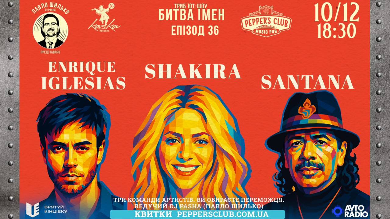 Музыкальная битва легенд: хиты Иглесиаса, Шакиры и Сантаны в исполнении украинских артистов. Зрители будут определять победителя, а Павел Шилько (DJ Паша) будет делиться историями о звездах.