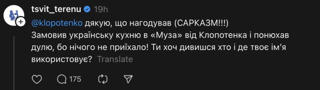 — Заказал украинскую кухню в Муза от Клопотенко и понюхал дулю, потому что ничего не приехало! Ты хоть смотришь, кто и где твое имя использует? — поинтересовался блогер.