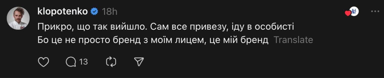 Инцидент произошел из-за того, что Александр заказал блюда украинской кухни, но еду так и не доставили. Из-за этого Терен обратился к шеф-повару публично в Threads, иронично поблагодарив за обед, которого не было.