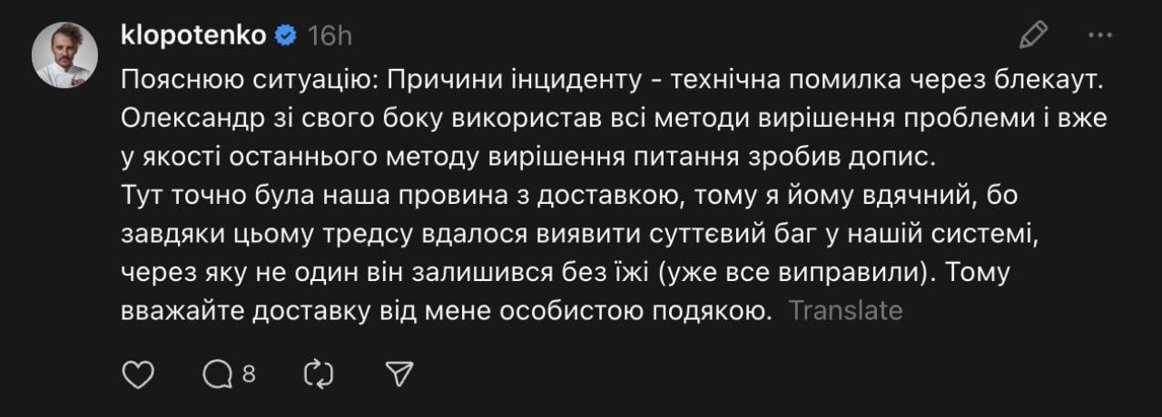 – Здесь точно была наша вина с доставкой, поэтому я ему благодарен, потому что благодаря этому тредсу удалось выявить существенный баг в нашей системе, из-за которого не он один остался без еды (уже все исправили). Поэтому считайте доставку от меня личной благодарностью, – успокоил комментаторов Клопотенко.