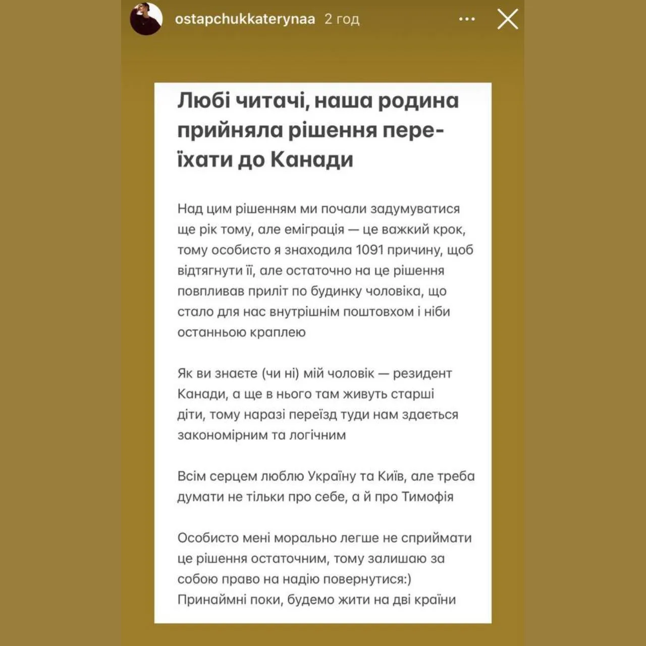 Семья переезжает в Канаду, о чем Екатерина Остапчук (в девичестве Полтавская) сообщила в своих соцсетях, поделившись планами на будущее и объяснив причины такого шага.