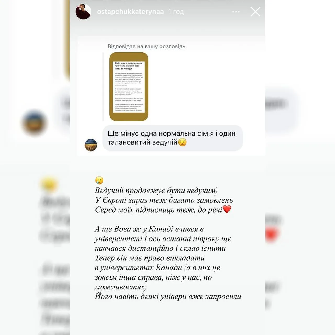 Екатерина отметила, что, несмотря на смену страны, Владимир Остапчук не планирует покидать профессиональную деятельность. Он продолжит работать ведущим на мероприятиях в Европе, где сейчас много заказов.