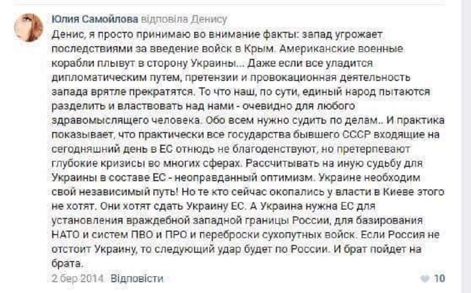В базе сайта Миротворец Самойлова еще с 2016 года — за посещение оккупированного Крыма не через админграницу Украины и открытую поддержку аннексии. В досье также приведен скриншот ее заявлений.