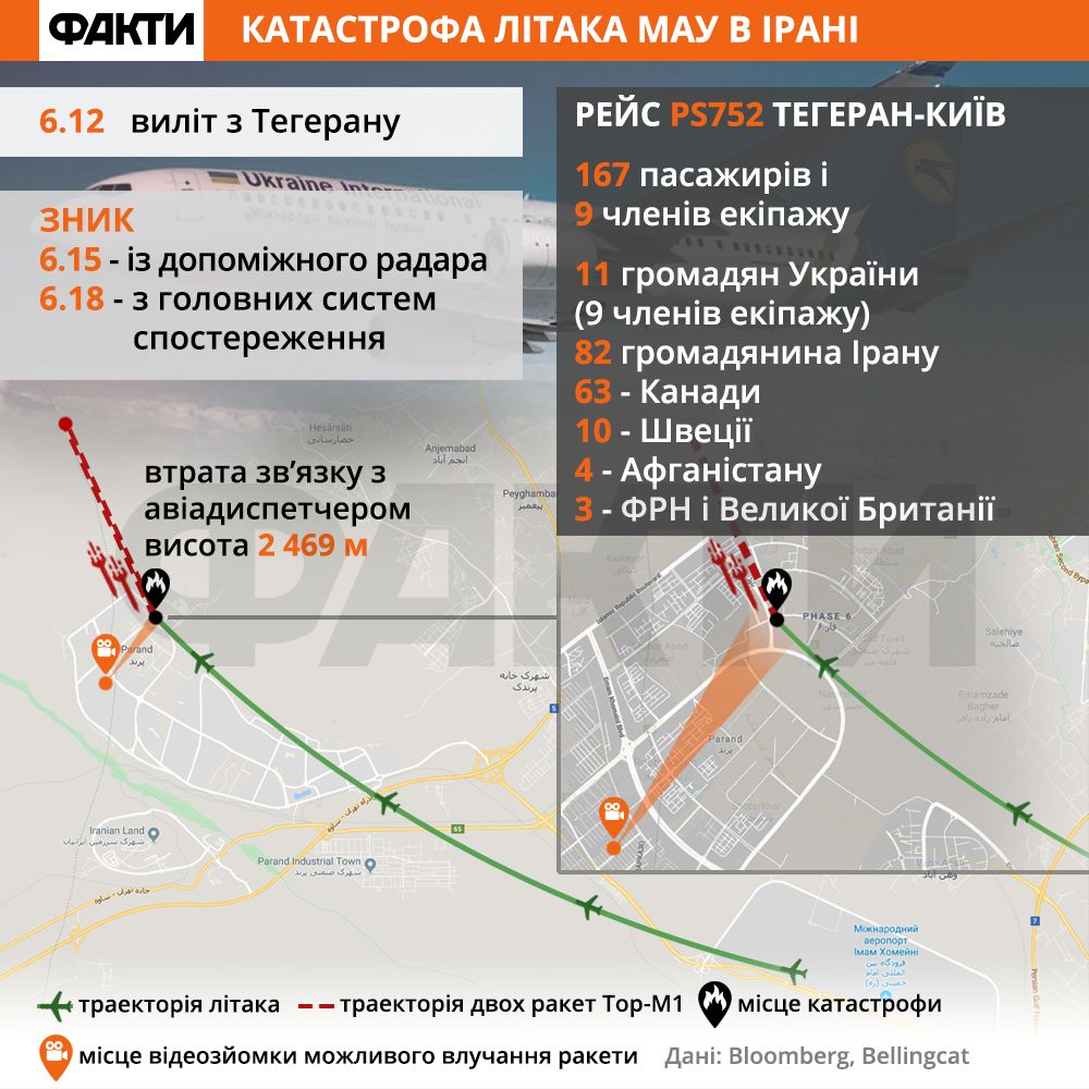 Лайнер выполнял рейс PS752 по маршруту Тегеран – Киев, на его борту находились граждане из шести стран: Украины, Ирана, Канады, Великобритании, Швеции и Афганистана.