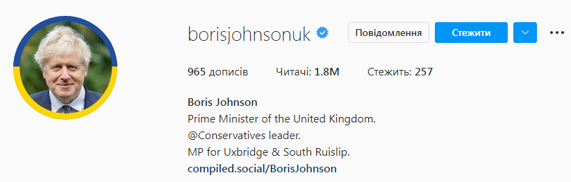 Что касается рамки фото в социальных сетях Джонсона, то она в сине-желтых цветах.