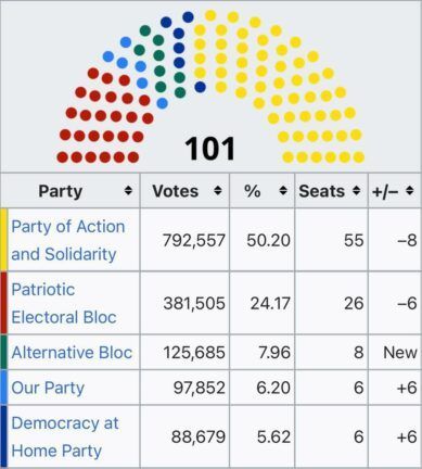 Так, согласно окончательным результатам, партия Санду получила 55 мест в парламенте. На втором месте оказался пророссийский Патриотический избирательный блок Додона – 26 мест. Блок Альтернатива – 8 мест, Наша партия – 6, еще 6 – Достоинство и правда (PPDA).