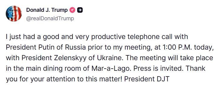- Президент США Дональд Трамп сообщил о проведении разговора с диктатором РФ Владимиром Путиным накануне встречи с президентом Украины Владимиром Зеленским 28 декабря.