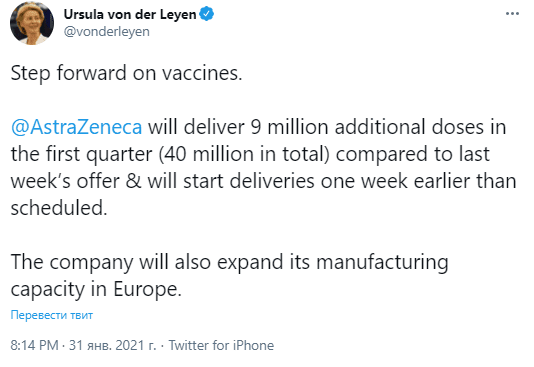 В компании AstraZeneca недавно сообщили, что смогут доставить ЕС только 25% из 100 млн доз, ожидаемых в первом квартале 2021 года.