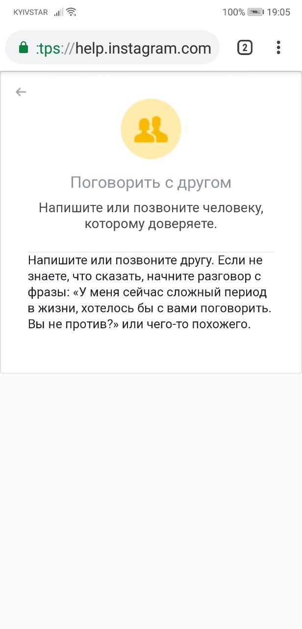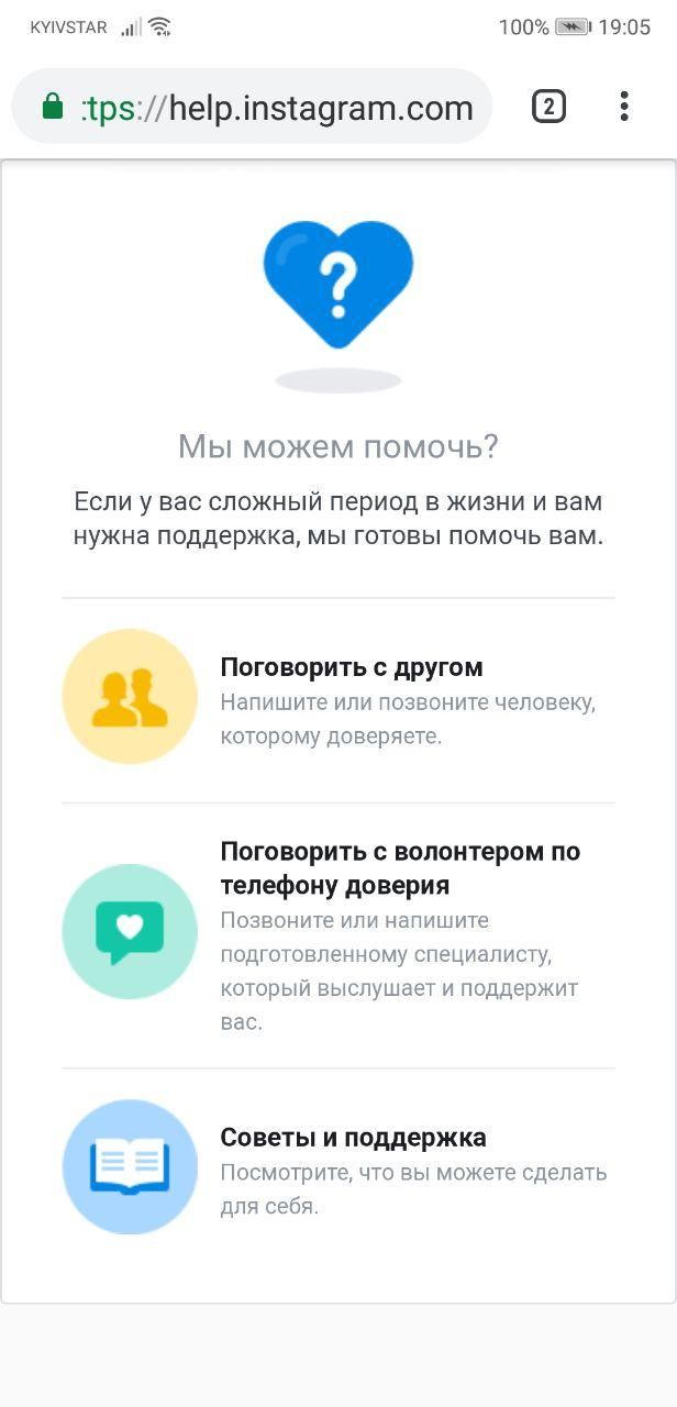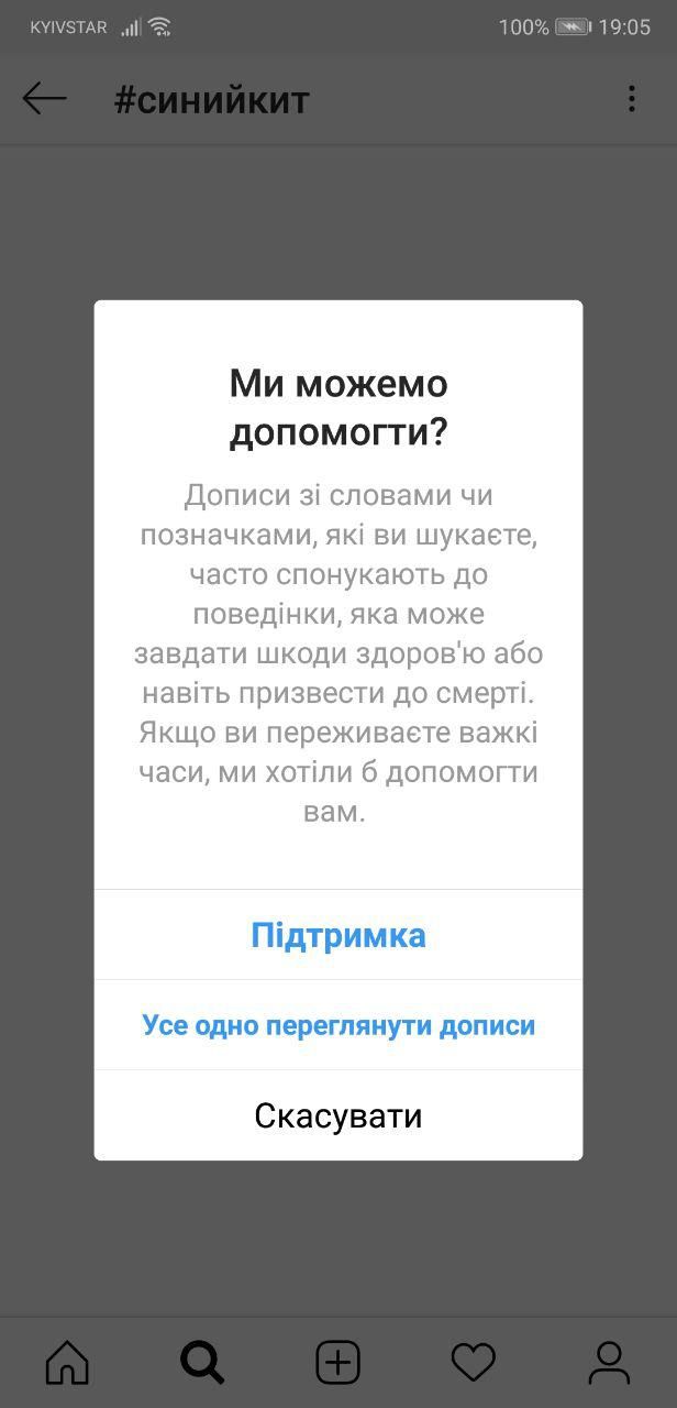 Кстати, в этом направлении неплохо сработал Instagram. Прежде, чем выдать результаты поиска по хештегу #синийкит, соцсеть интересуется состоянием пользователя и предлагает помощь.