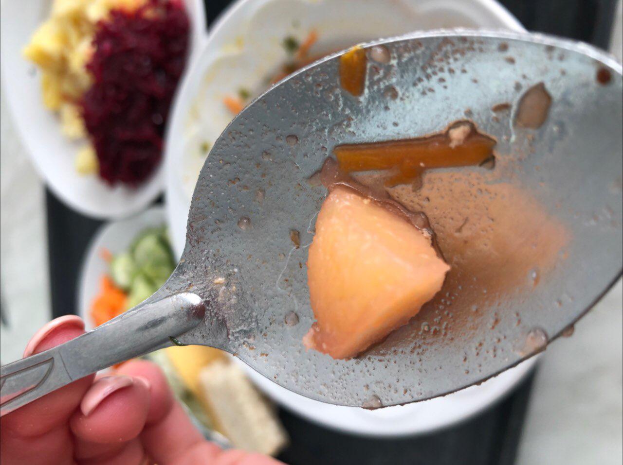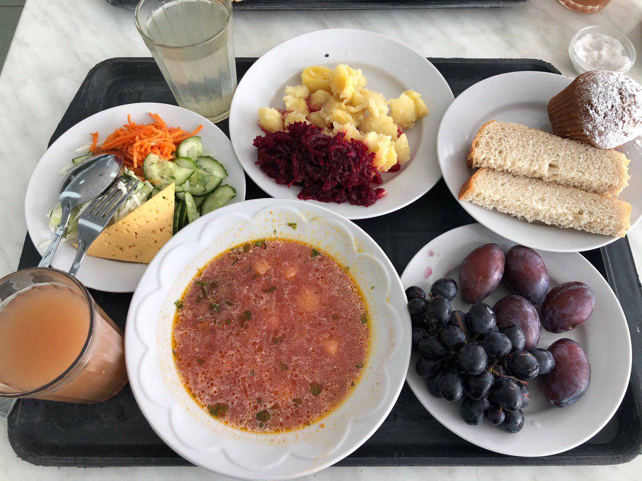 Я взяла себе вегетарианское меню — борщ, в котором плавали кусочки мяса, хотя на раздаче уверяли в обратном, и кусочек лески, как “приятный” бонус. Салат — потертая на терку морковь, капуста и порезанный огурец. Гарнир — холодная картошка с потертой свеклой. Фрукты как дополнение к вегетарианскому меню и два стаканчика сока. Ничего из этого я не доела.
