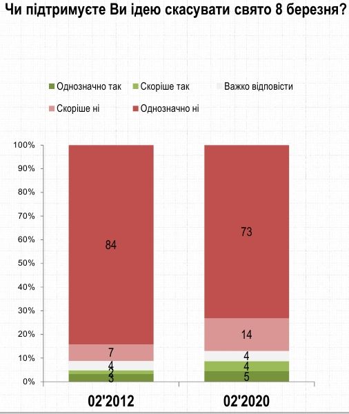В 2012 году 91% украинцев были против отмены празднования 8 марта, поддерживали идею лишь 5% респондентов.