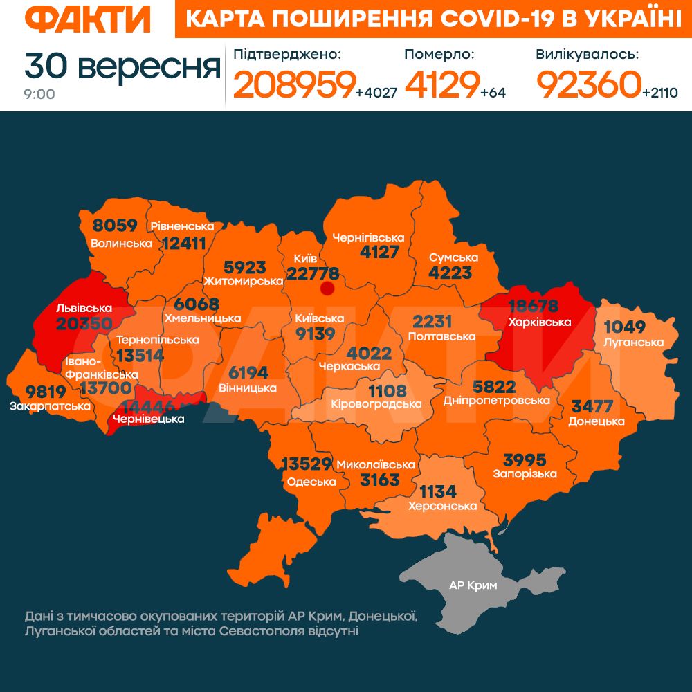 30 сентября в Украине обнаружили антирекорд суточного прироста. За сутки медики подтвердили еще 4 027 случаев инфицирования.