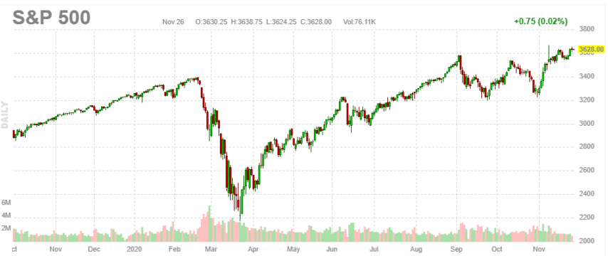 Инвестирование в акции — это риск. Но выдающейся чертой фондового рынка в этом случае является то, что в долгосрочной перспективе он все равно растет. На графике ниже можно увидеть динамику цен на акции 500 крупнейших публичных компаний США за последний год.