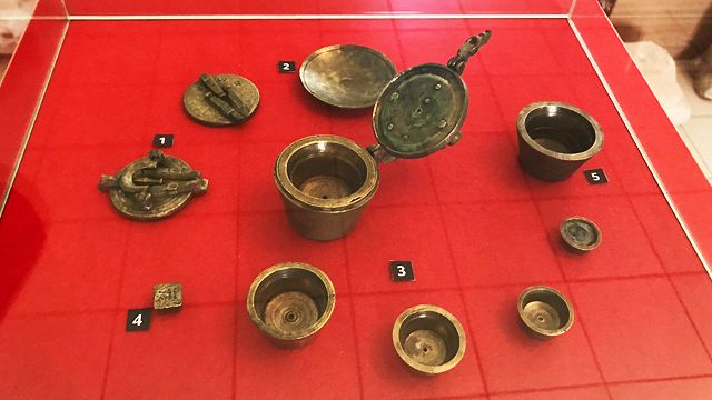 Набор Разбивной фунт изготовлен из бронзы. В те времена такими весовыми приборами пользовались ювелиры и фармацевты.