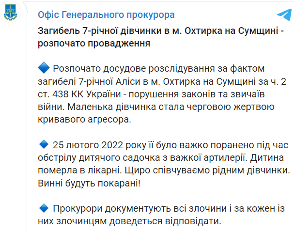 Офис генпрокурора Украины уже открыл уголовное производство по факту гибели 7-летней девочки Алисы в Ахтырке.