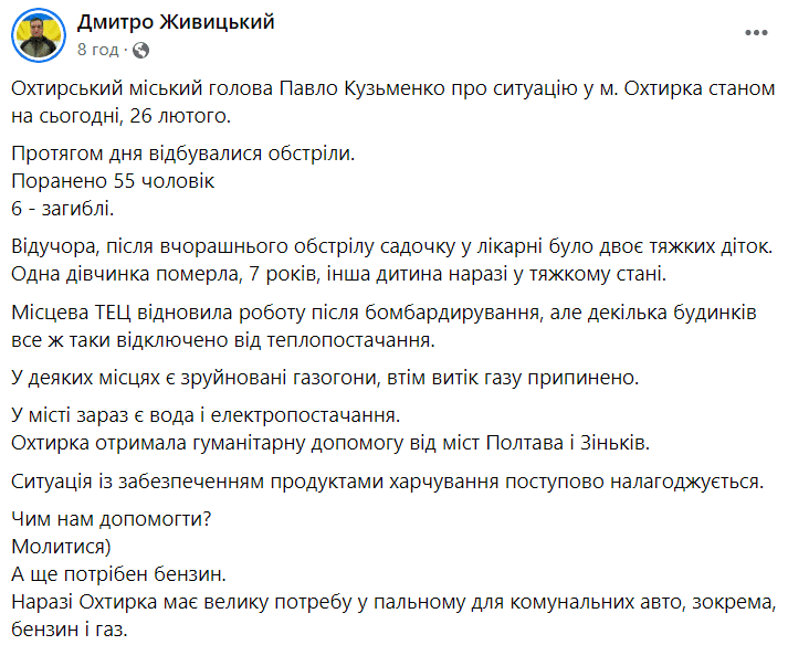 25 февраля сообщалось, что российские оккупанты подвергли массированному обстрелу из Ураганов город Ахтырка Сумской области. Снаряды попали в укрытие и детский сад, в результате чего погибли и получили тяжелые ранения мирные жители, среди которых дети.