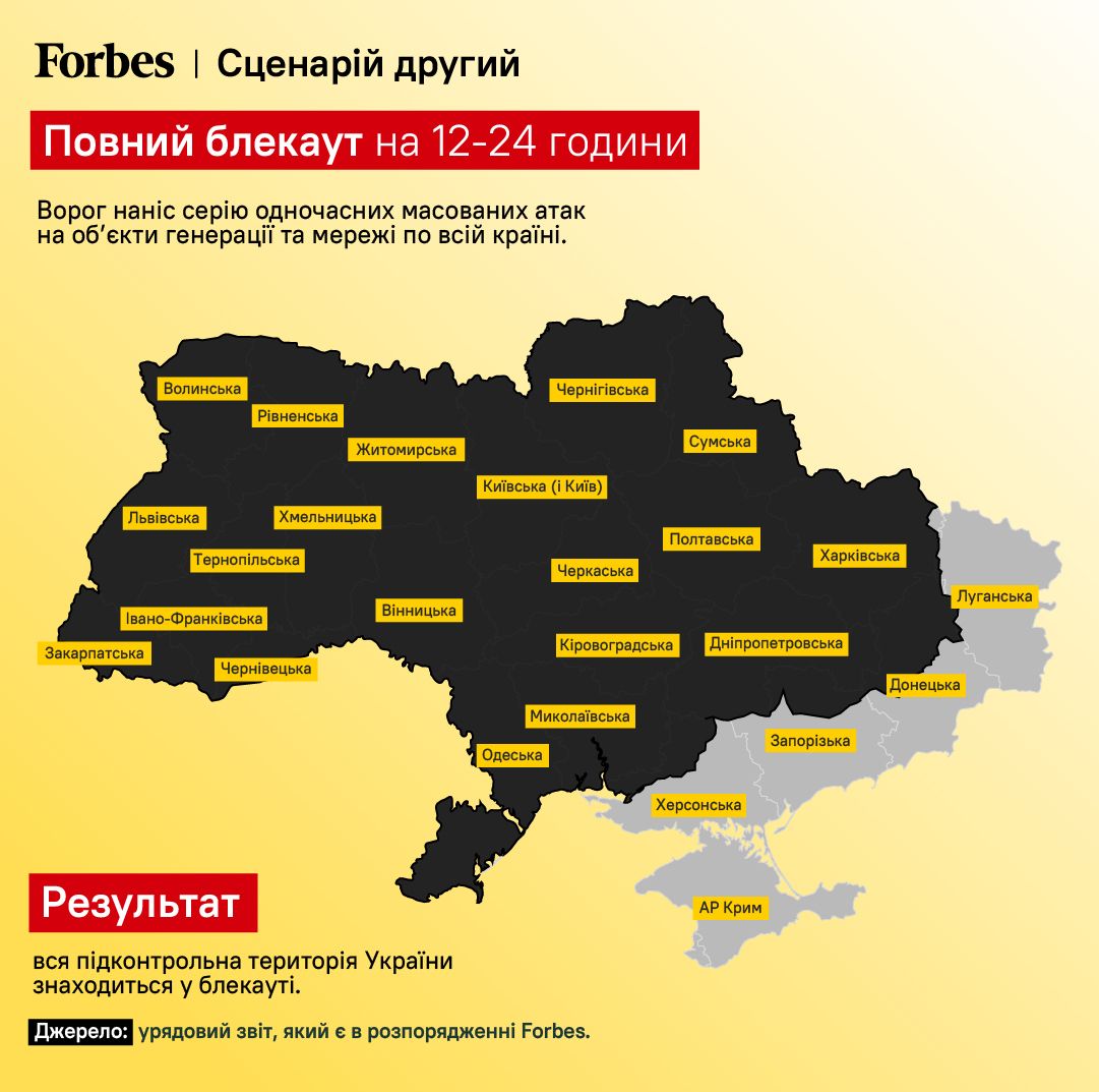 Forbes пишут, что последствия от вероятных будущих атак россиян по энергетике могут иметь три главных сценария блэкаута, согласно отчету, которым располагает правительство Украины.