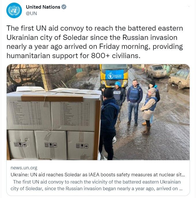 Первый груз гуманитарной помощи ООН прибыл в прифронтовой город Соледар на востоке Донецкой области.