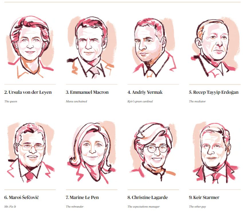 В рейтинге деятелей Ермак занимает четвертое место. Его опередила премьер Италии Джорджа Мелони, президент Франции Эммануэль Макрон и президент Еврокомиссии Урсула Фон дер Ляйен. После Ермака в рейтинге президент Турции Реджеп Тайип Эрдоган.