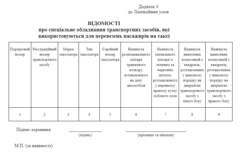 - сведения о специальном оборудовании транспортных средств, используемых для перевозок пассажиров на такси, по форме согласно приложению 4 (для внутренних и международных перевозок пассажиров);