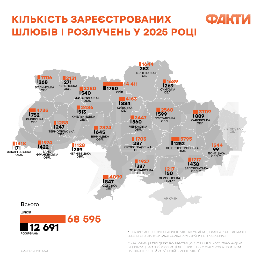 В Украине в 2025 году было зарегистрировано 68 595 браков. В среднем на каждые 5,4 заключенных брака приходится один развод. Но по регионам ситуация очень разная, ведь где-то браки значительно крепче, а где-то количество разводов сравнительно большое.