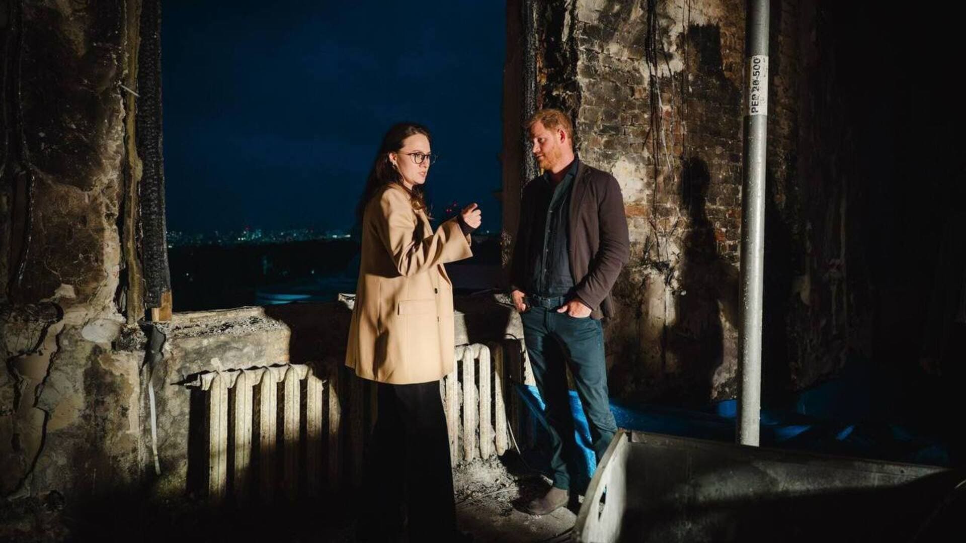 Помимо разрушенного здания правительства, принц Гарри побывал еще на одном из мест обстрела в Киеве.