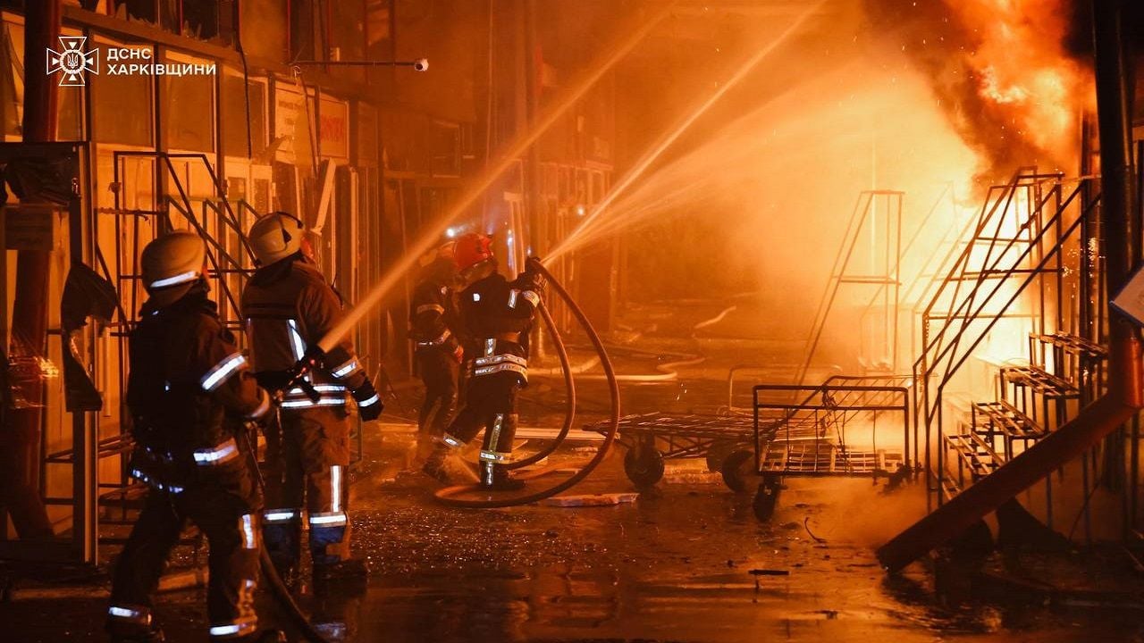 В Харькове в Киевском районе загорелись торговые павильоны на площади 2800 кв. м. В Салтовском районе от взрыва разрушен жилой дом, который тоже загорелся. Также загорелись гаражи на площади 350 кв. м.