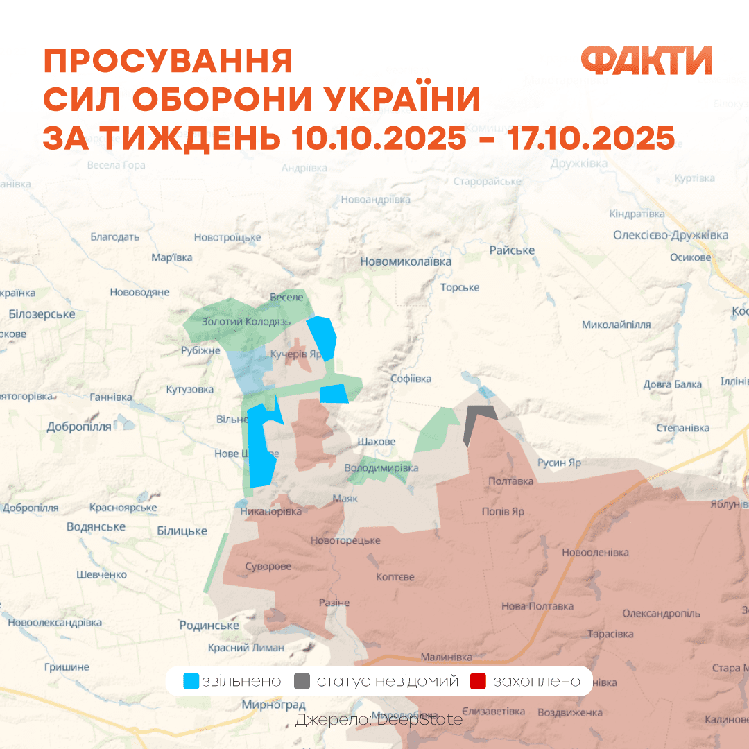 16 октября Генштаб ВСУ сообщил, что на Покровском направлении с начала операции 21 августа Силы обороны освободили 182,8 кв. км территории. Кроме того, ликвидировано не менее 13 945 российских военных, в том числе 8 402 – это безвозвратные потери.