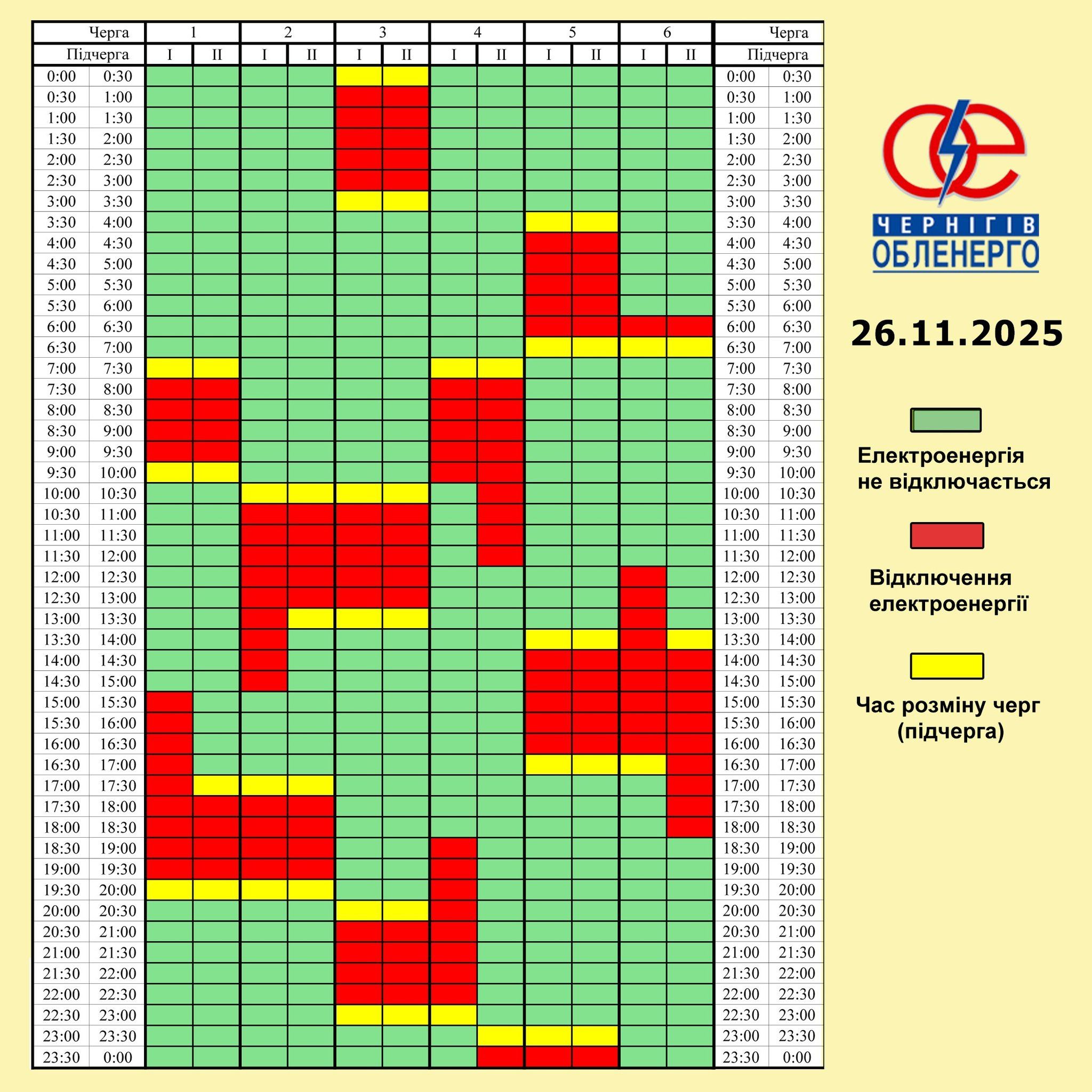 Графики ограничения электроснабжения на 26 ноября в Чернигове и Черниговской области обнародовали в АО Черниговоблэнерго.