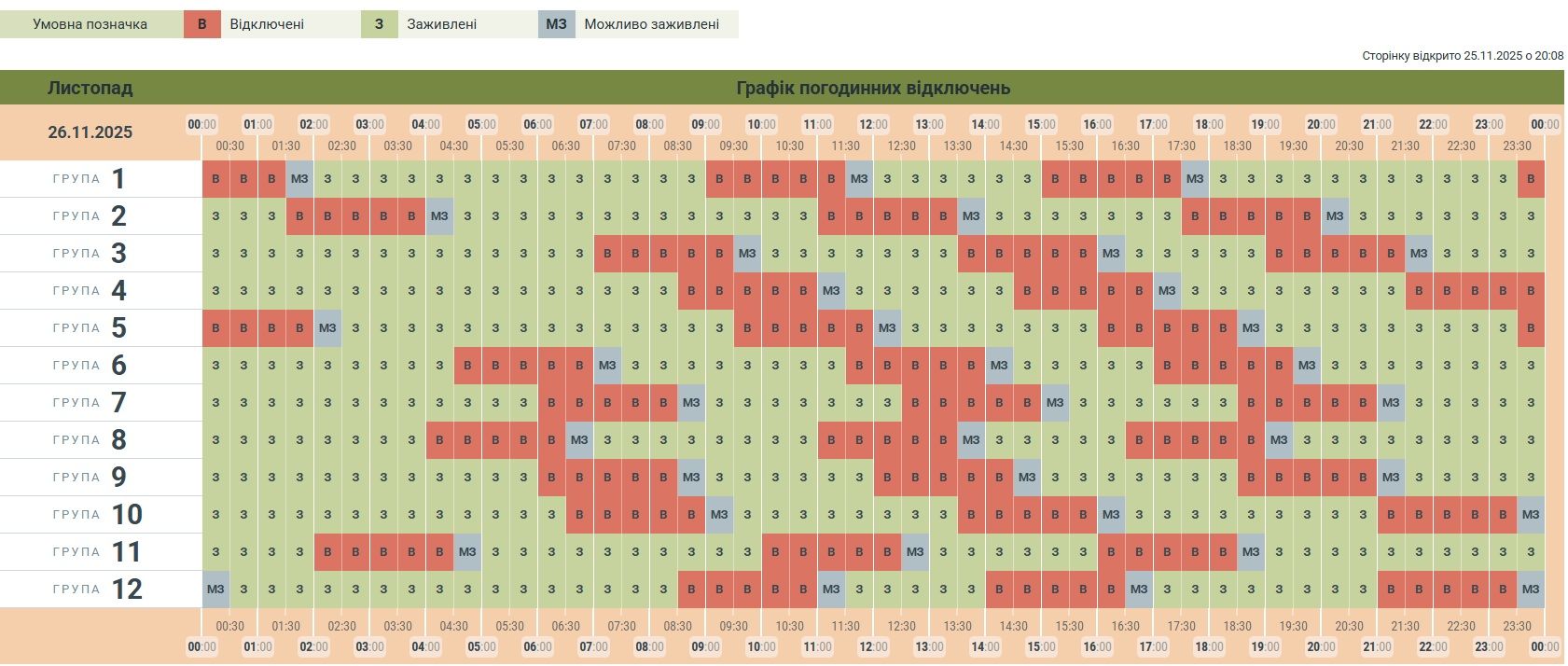 АО Черновцыоблэнерго обнародовало ориентировочный график подачи электроэнергии для групп потребителей на 26 ноября.