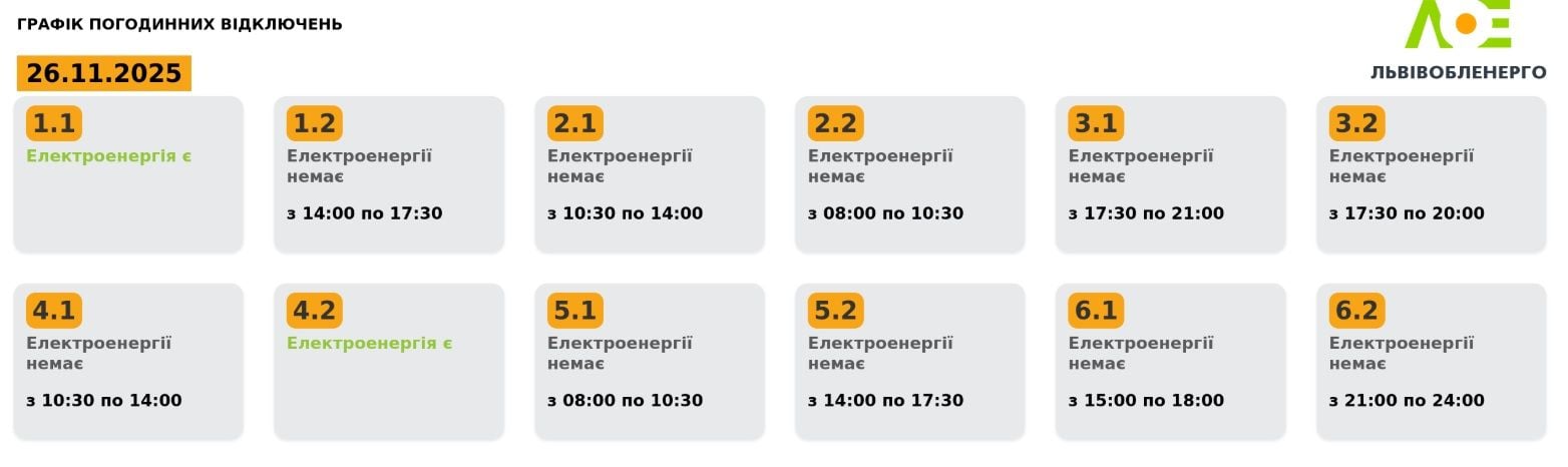 Как сообщили во Львовоблэнерго, 26 ноября во Львовской области будут действовать графики почасового отключения электроэнергии.