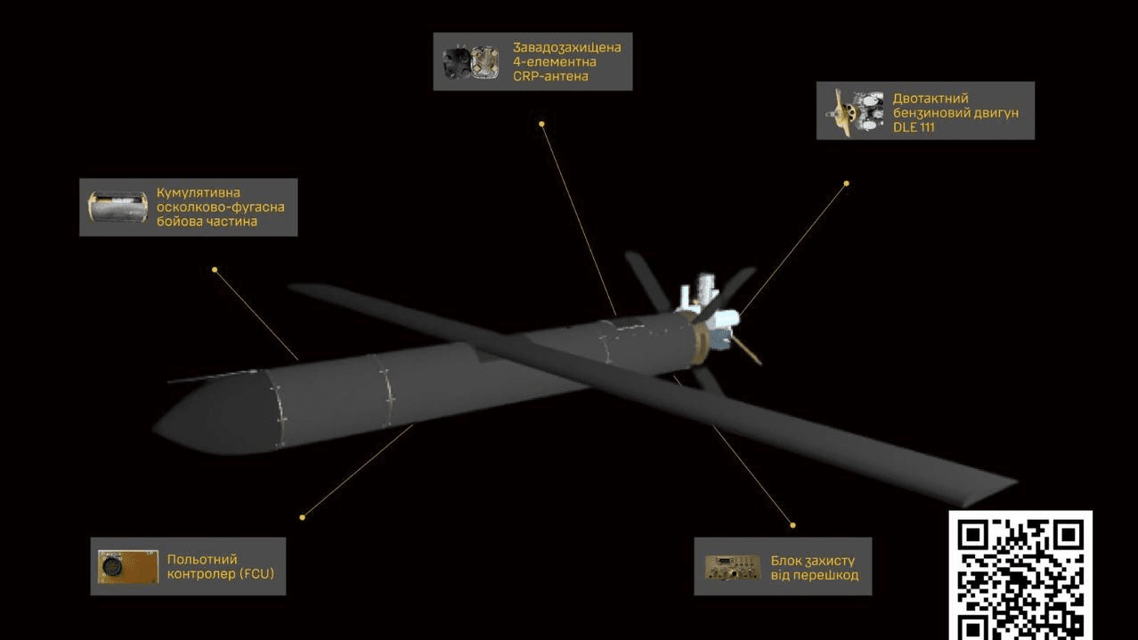 Силовая установка — китайский бензиновый двигатель DLE 111, который ранее фиксировался и в российских дронах Гербера, БМ-35, Пародия и Дельта. Топливный бак вмещает 28 литров, что обеспечивает дальность полета примерно 300 км.