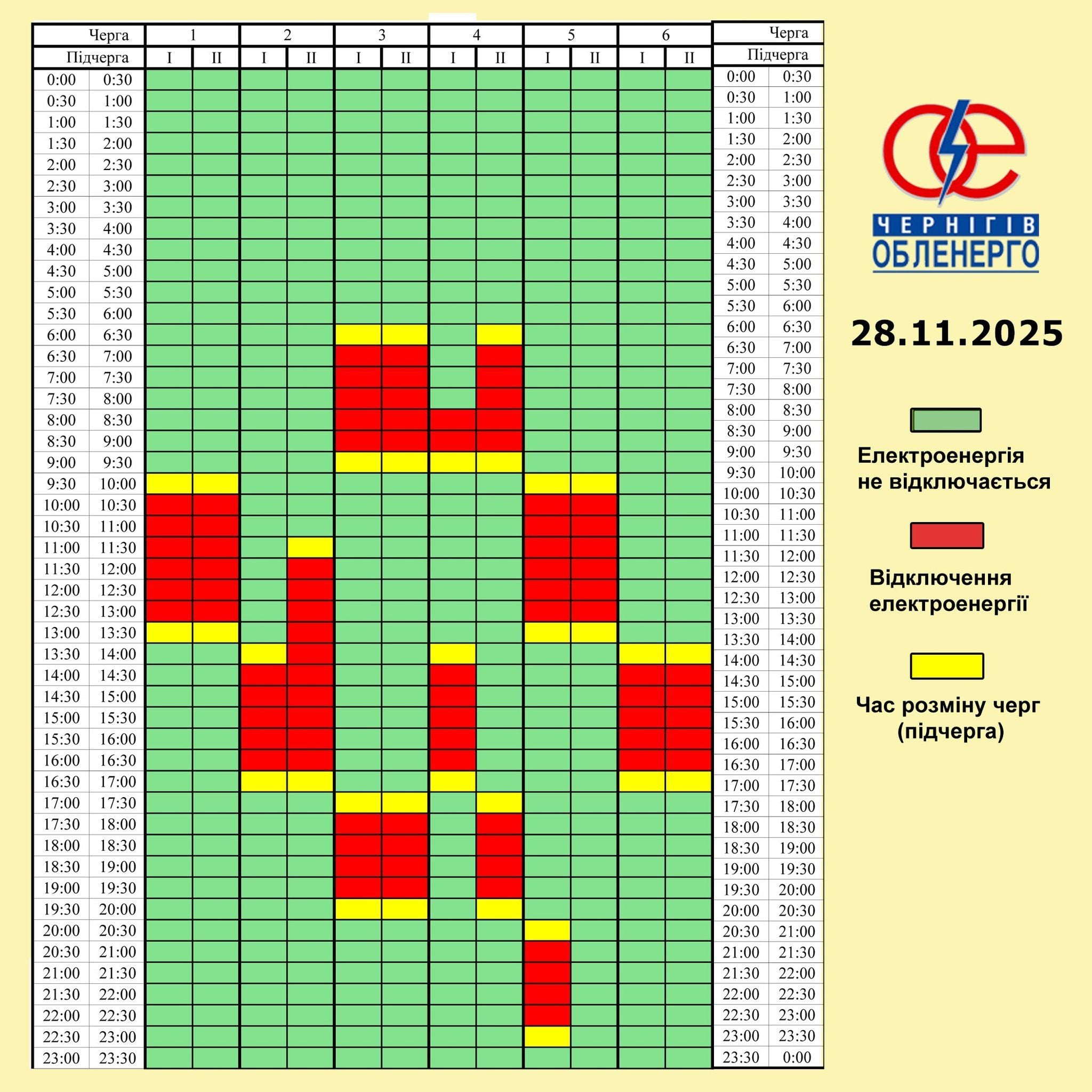 Компания Черниговоблэнерго опубликовала график почасовых отключений, который будет действовать 28 ноября в Чернигове и области.