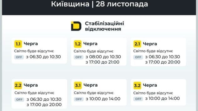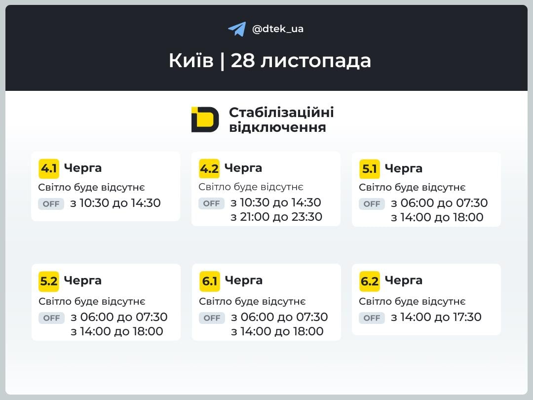 Актуальные графики отключения электроэнергии на 28 ноября уже обнародованы компанией ДТЭК для жителей Киева.