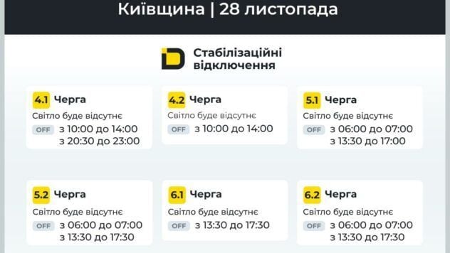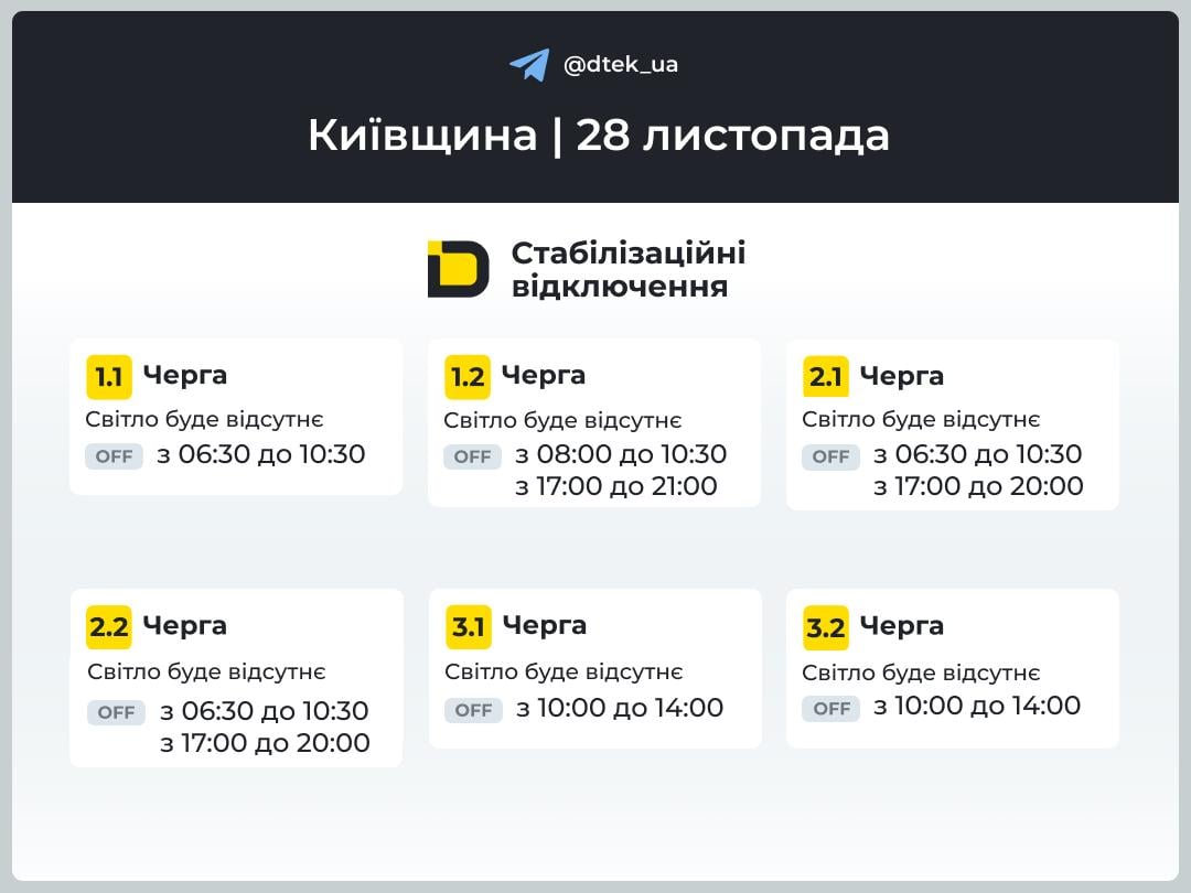 ДТЭК обнародовал графики отключения электроэнергии для жителей Киевской области, которые будут действовать 28 ноября.
