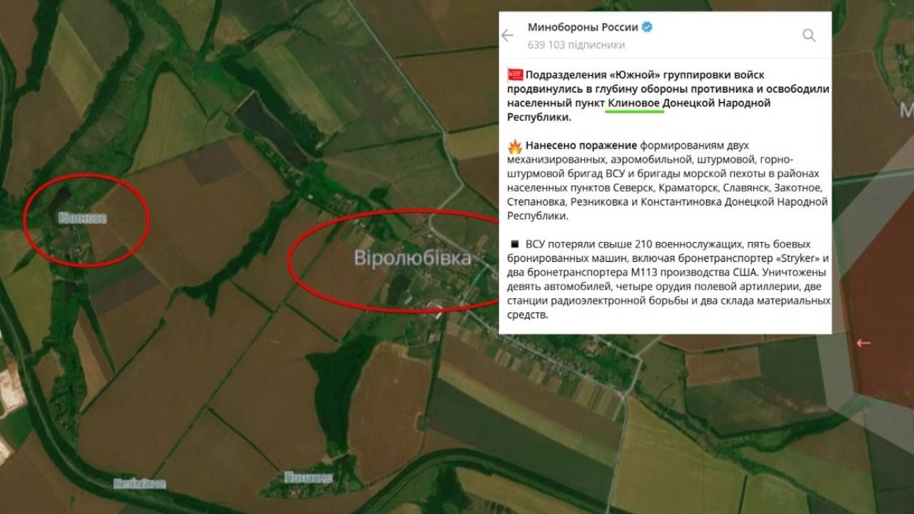 Согласно данным карт Генштаба ВСУ, OSINT-проекта DeepState и Института изучения войны (ISW), и Клиновое, и Веролюбовка в Краматорском районе остаются под контролем украинских Сил обороны и расположены в нескольких километрах от линии соприкосновения.
