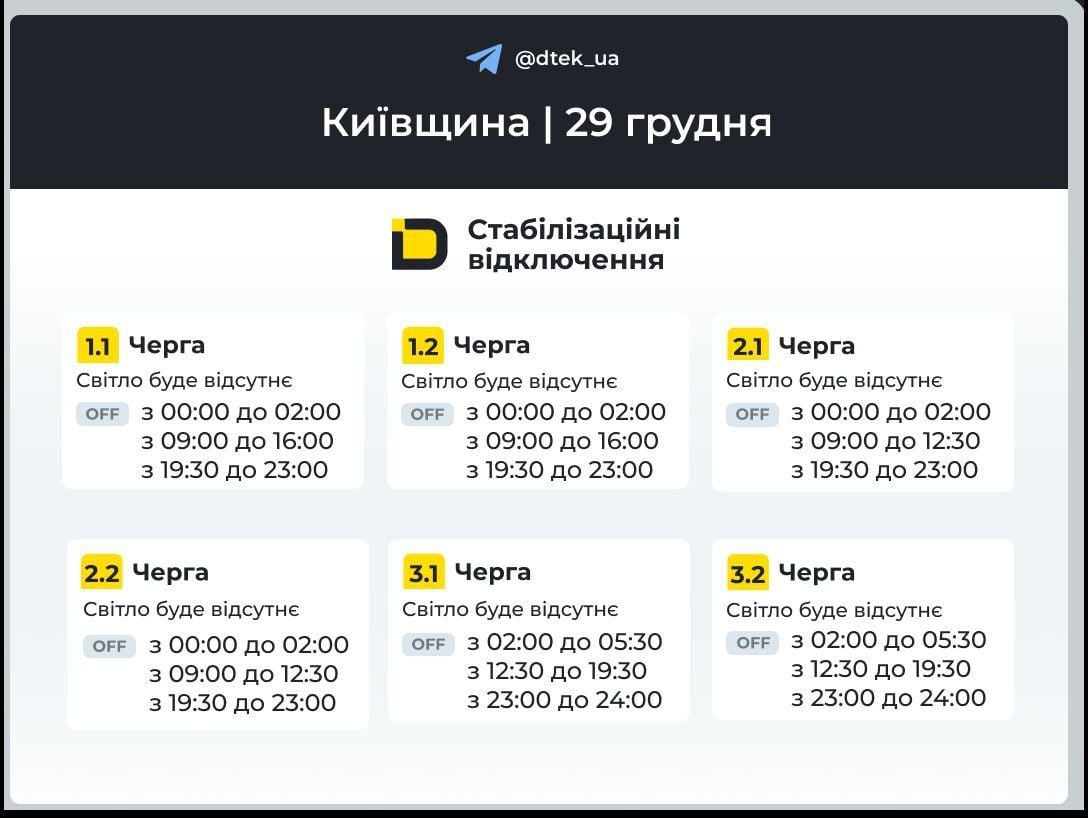 ДТЭК обнародовал графики отключений света на 29 декабря для Киевщины.