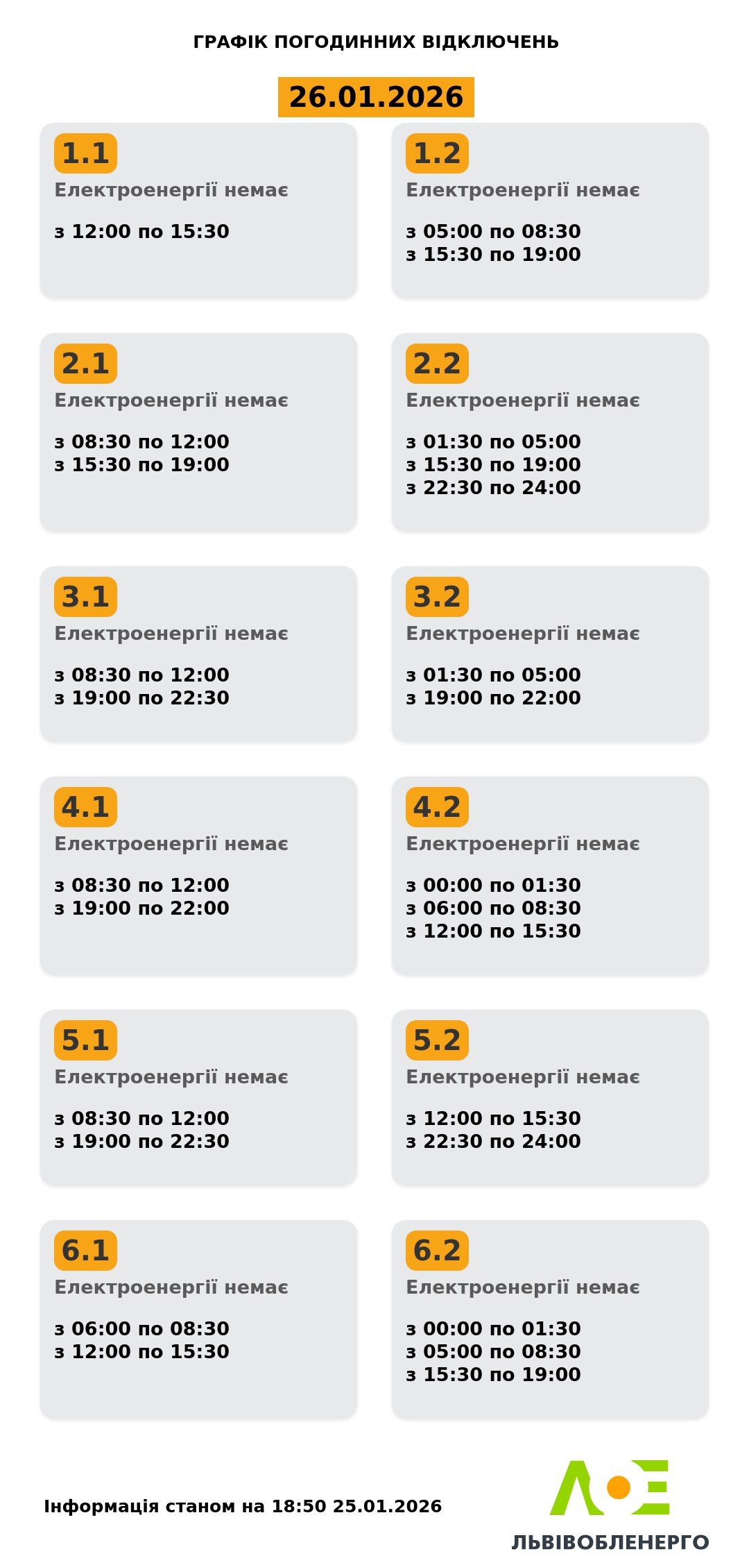 АО Черновцыоблэнерго обнародовало ориентировочный график отключения света на 26 января: