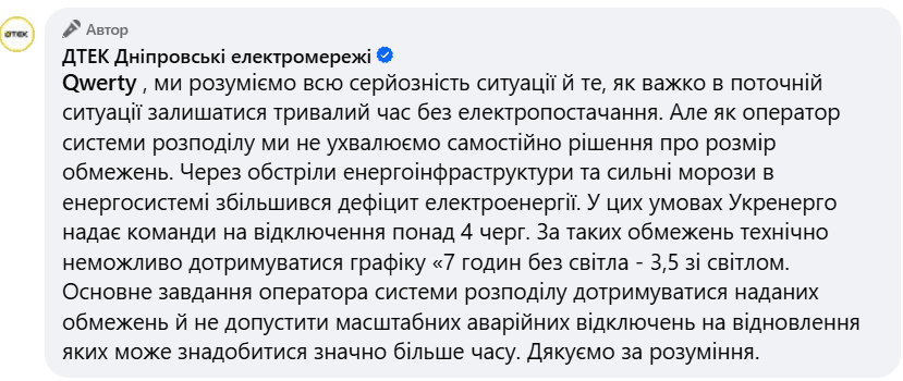 В ДТЭК Днепровские электросети объясняют, что продленные ограничения обусловлены серьезными повреждениями генерационных мощностей, линий передачи и распределительных сетей.
