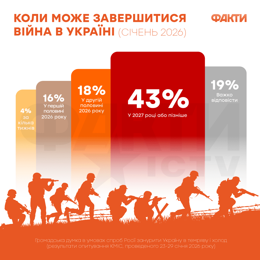 Согласно опросу Киевского международного института социологии, только 20% украинцев ожидают, что война закончится в ближайшие недели или хотя бы в первой половине 2026 года.