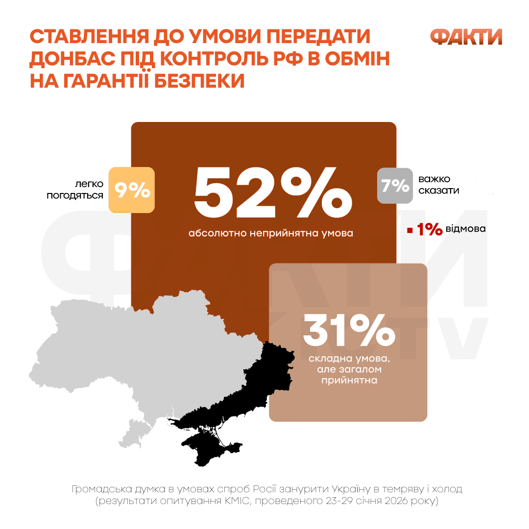 В то же время 52% респондентов категорически отвергают предложение передать под контроль России весь Донбасс в обмен на гарантии безопасности.